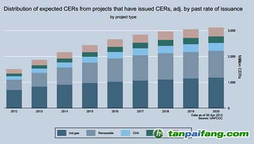 盡管歐盟從2013年4月起全面禁止HFC-23等特定工業(yè)氣體減排量進入EU ETS,同時規(guī)定2013年之前產(chǎn)生的未使用國際碳信用在今年履約后將不能再使用,但目前已經(jīng)在CDM EB注冊的7635個CDM項目中仍有很大的供給潛力,導(dǎo)致國際碳信用供需仍然不平衡。根據(jù)UNFCCC網(wǎng)站的預(yù)測,僅預(yù)測已經(jīng)簽發(fā)的2,584個項目在2020年前的可簽發(fā)量就超過30億噸,如下圖所示,其中來源可再生能源項目的CER增長明顯。若加上未簽發(fā)項目,潛在的供應(yīng)量更加驚人。 本%文$內(nèi)-容-來-自;中_國_碳|排 放_交-易^網(wǎng)^t an pa i fang . c om