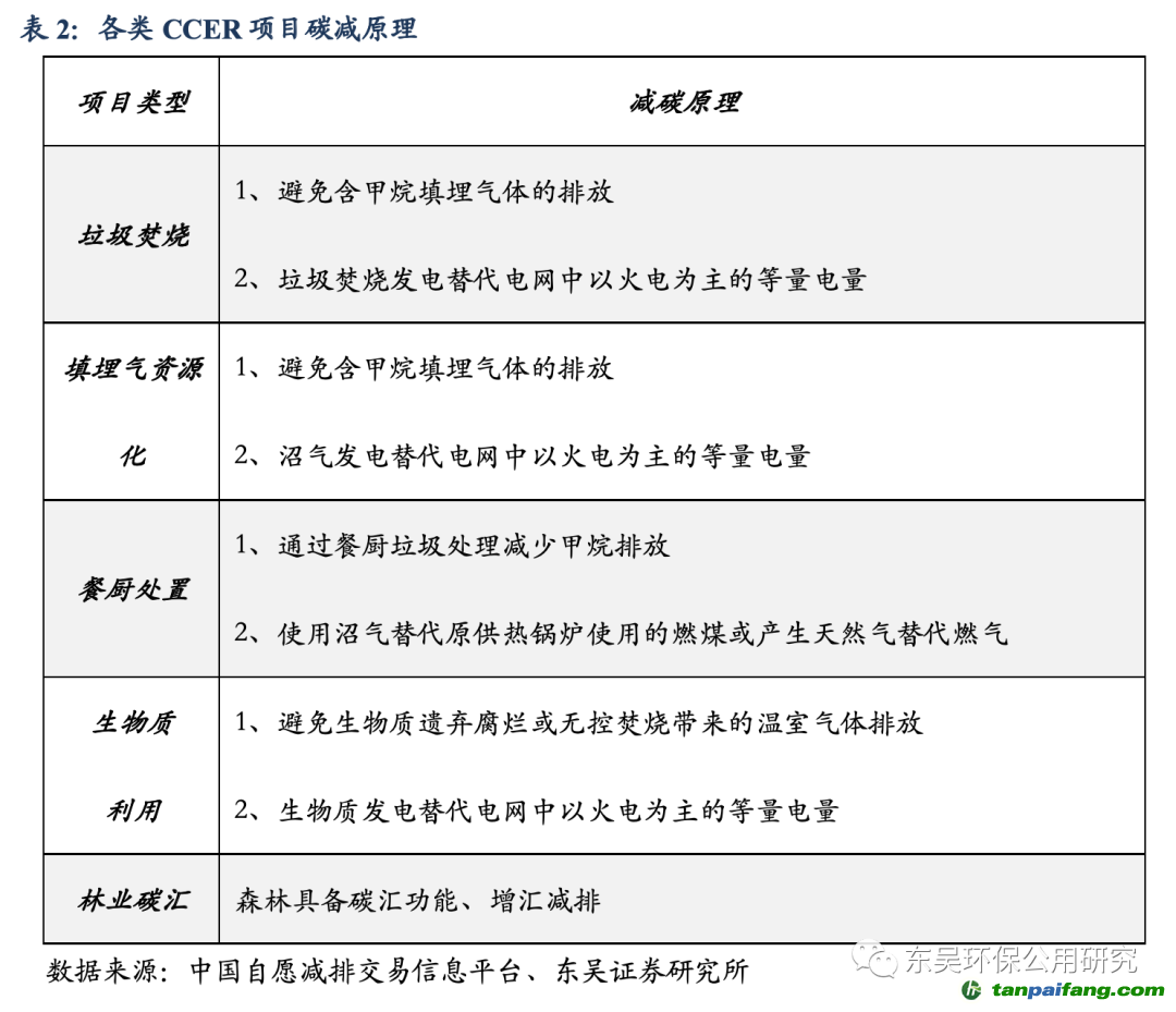 依據(jù)中國自愿減排交易信息平臺,我們選取了CCER自愿減排主要鼓勵(lì)的可再生能源、甲烷利用及林業(yè)碳匯三類項(xiàng)目中5種細(xì)分類型進(jìn)行了減碳量及經(jīng)濟(jì)效益測算,中性情景假設(shè)下,我們預(yù)計(jì)CCER碳價(jià)為30元/tCO2,在可再生能源替代火電發(fā)電的垃圾焚燒、填埋氣資源化、生物質(zhì)利用三種項(xiàng)目類型中,填埋氣資源化減排及經(jīng)濟(jì)效益最為突出,度電減碳量可達(dá)0.00578噸,度電增收0.17元,利潤彈性102%~339%。此外,餐廚處置項(xiàng)目也可以通過產(chǎn)生沼氣供氣或供熱實(shí)現(xiàn)減排、利潤彈性達(dá)18.75%;林業(yè)碳匯項(xiàng)目每畝儲碳量0.90tCO2,每畝林增收27元,利潤彈性達(dá)66.73%。
