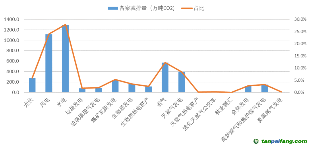 公開披露的各類型CCER項(xiàng)目備案減排量及占比