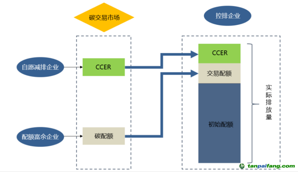 上述這兩種交易行為統(tǒng)稱為CCER交易,也可以理解為通過碳交易市場(chǎng),協(xié)調(diào)高碳排企業(yè)及低碳排企業(yè)閑置二氧化碳排放量配額。在這一機(jī)制下,可以促進(jìn)企業(yè)進(jìn)行技術(shù)環(huán)保升級(jí)來減少碳排放量,從而達(dá)到節(jié)能減排的效果,或者通過高碳排企業(yè)購買碳排放配額實(shí)現(xiàn)二氧化碳減排目的。