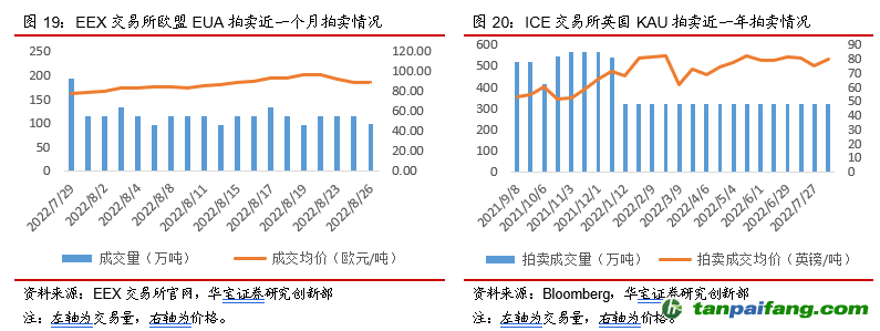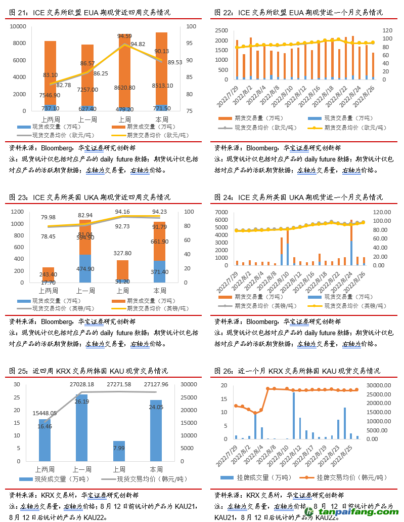 本周(8月22日-8月28日)國外碳配額二級市場價(jià)格漲跌不一,但成交量均有所上漲。歐盟本周一級市場拍賣量442.15萬噸,同比下降22.98%,拍賣周均價(jià)92.32歐元/噸,相比上周的周均價(jià)下浮0.66%,根據(jù)EEX官網(wǎng)拍賣日歷,由于2022年9月單次拍賣量將回歸正常,相比8月單次拍賣量有所回升,故碳價(jià)下跌。歐盟二級市場EUA總成交量小幅上漲2.03%,本周平均碳價(jià)有所回調(diào),在90歐元/噸左右徘徊,期現(xiàn)貨價(jià)格分別同比下降4.72%、5.58%,周內(nèi)期現(xiàn)貨碳價(jià)呈U型走勢。本周英國二級市場本周UKA期現(xiàn)貨成交量分別上漲101.92%、625.39%,現(xiàn)貨成交均價(jià)下跌1.01%,期貨成交均價(jià)上漲0.08%。韓國市場本周KAU22現(xiàn)貨成交量大幅增加,合計(jì)成交量24.05萬噸,同比上升200.88%,平均碳價(jià)略有下跌,跌幅為0.53%。 本+文`內(nèi).容.來.自:中`國`碳`排*放*交*易^網(wǎng) t a np ai fan g.com