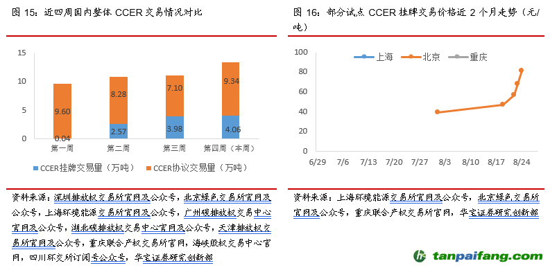 本周(8月22日-8月28日)全國整體碳信用(CCER)二級交易市場量價(jià)齊升。從交易量上看,本周CCER交易量上漲20.90%,主要是北京、天津、上海等地CCER交易量增加。根據(jù)可跟蹤到的碳試點(diǎn)CCER掛牌交易價(jià)格,近2個(gè)月僅有北京試點(diǎn)公布掛牌交易價(jià)格,本周北京試點(diǎn)有三筆CCER掛牌交易,CCER掛牌價(jià)格呈快速上漲走勢,本周北京CCER成交均價(jià)相比上周增長45.66%。 本`文@內(nèi)-容-來-自;中^國_碳0排0放^交-易=網(wǎng) ta n pa i fa ng . co m
