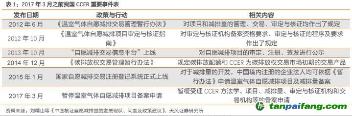 2017年3月,CCER暫停,國家暫緩受理CCER方法學、項目、減排量、審定與核證機構和交易機構等的備案申請。