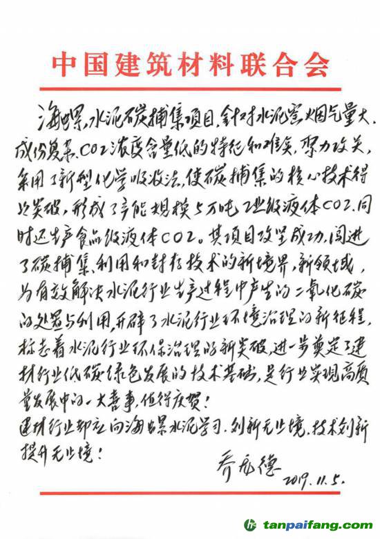 碳捕集項(xiàng)目給予高度評(píng)價(jià),表示慶賀,號(hào)召建材行業(yè)向海螺水泥學(xué)習(xí)。