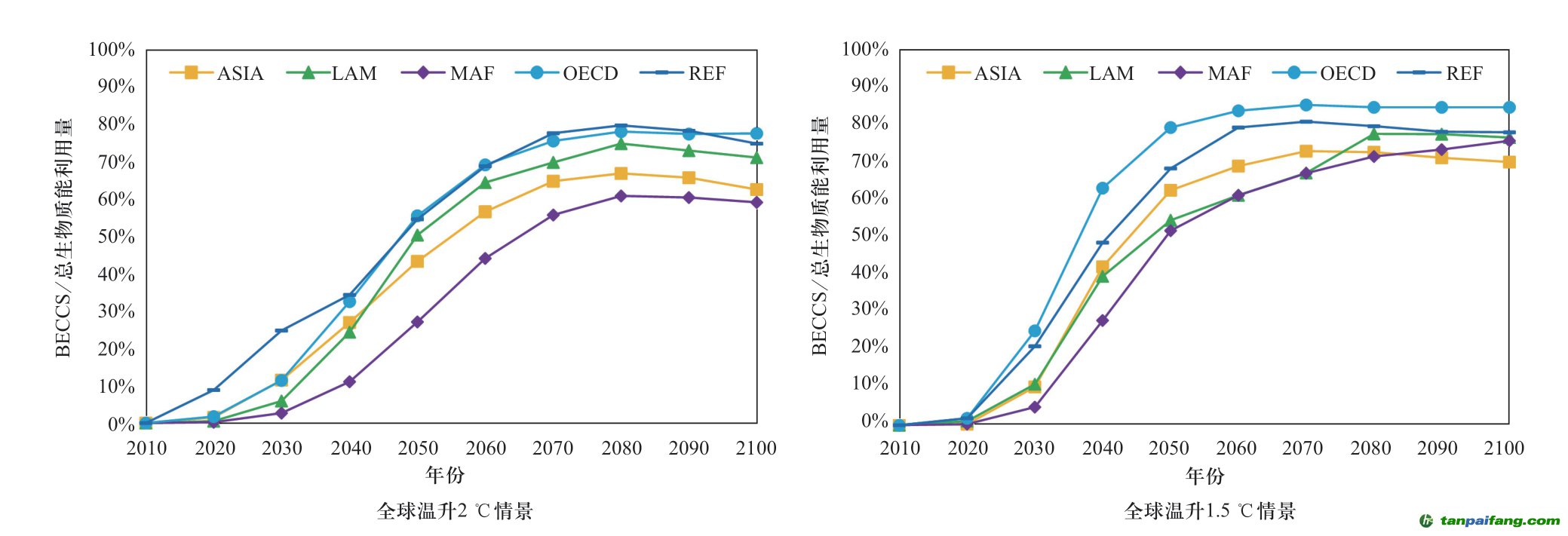 由于BECCS僅考慮了生物質(zhì)能利用中適于結(jié)合CCS的技術(shù)路徑,因而一般其利用量會低于生物質(zhì)能的利用量。全球溫升2 ℃情景下,生物質(zhì)能中BECCS的比重在2030年開始快速增加,各區(qū)域從2030年占比2.7%~24.55%,到2050年增加到26.96%~55.33%。從2070年開始各區(qū)域的BECCS占生物質(zhì)能的比重穩(wěn)定在60%~80%(見圖10)。不同區(qū)域的BECCS在該區(qū)域總生物質(zhì)能利用量中的占比也有差別,2020—2100年的大部分時間里OECD是占比最大的區(qū)域,而MAF是占比最小的區(qū)域。全球溫升1.5 ℃情景下,BECCS在生物質(zhì)能中的比重也在2030年開始迅速增加。與2 ℃溫升相比,1.5 ℃情景下BECCS在生物質(zhì)能中的比重更早趨于穩(wěn)定,并且比重更高。全球溫升1.5 ℃情景下,2050年各區(qū)域BECCS的比重就達到51.74%~79.15%,并且進一步增加。到2100年,BECCS在生物質(zhì)能利用中的比重最高的OECD區(qū)域?qū)⑦_到84.52%,即使比重最低的ASIA區(qū)域也達到70.01%。 內(nèi)-容-來-自;中_國_碳_0排放¥交-易=網(wǎng) t an pa i fa ng . c om