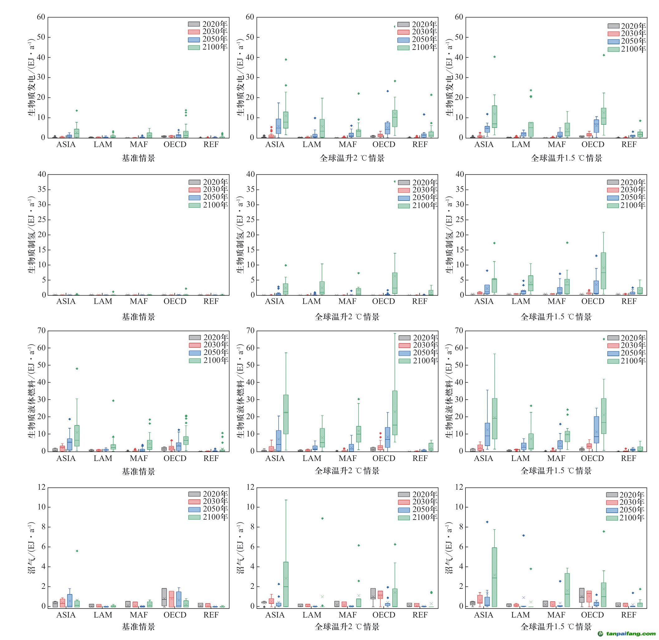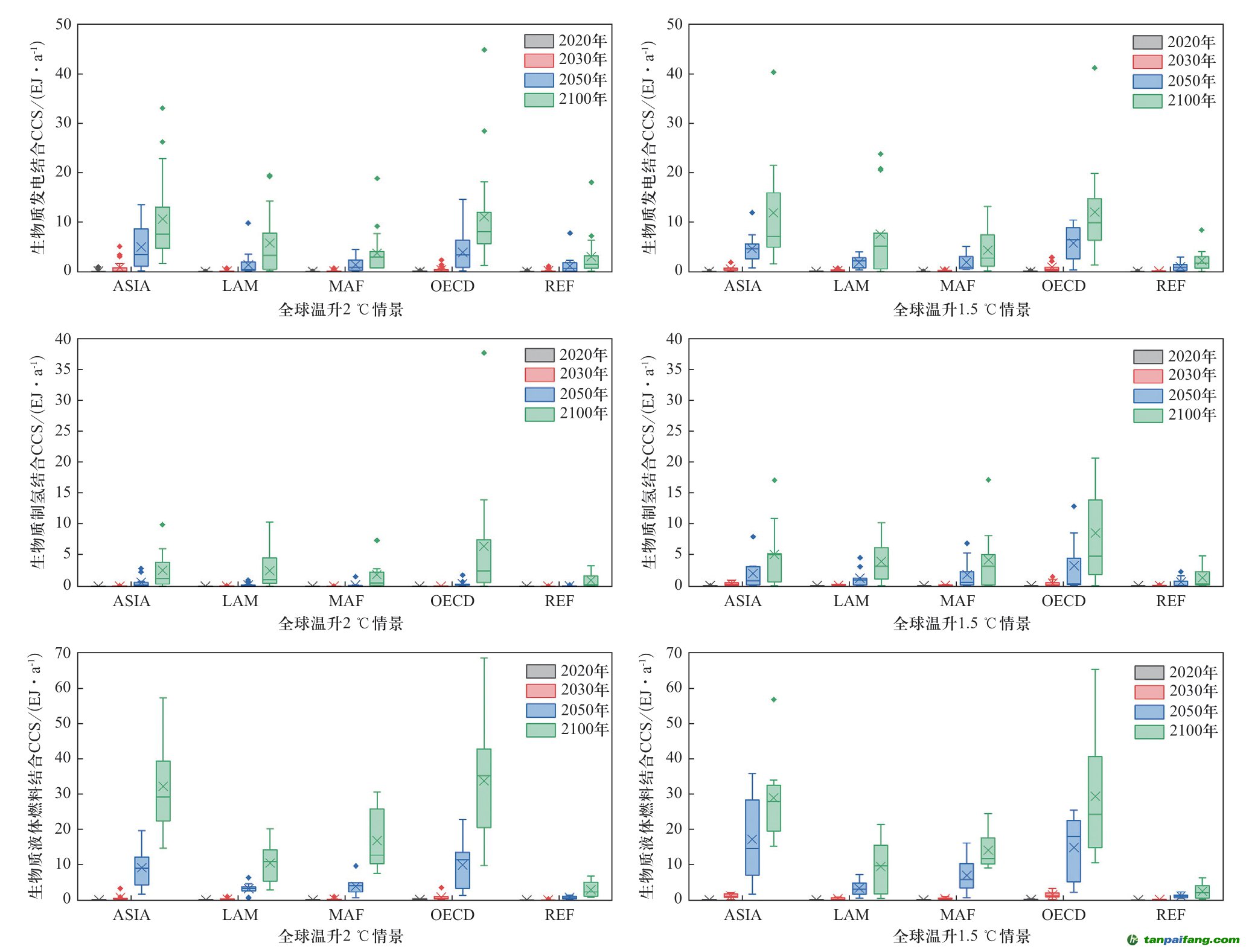 本研究基于全球情景研究結(jié)果,結(jié)合全球各區(qū)域生物質(zhì)資源利用現(xiàn)狀、生物質(zhì)能潛力與碳封存潛力,評估分析了全球溫升2 ℃和1.5 ℃情景下主要區(qū)域的BECCS發(fā)展?jié)摿?。各區(qū)域BECCS從2030年到2050年開始快速發(fā)展。全球溫升2 ℃情景下,主要以生物質(zhì)發(fā)電和生物質(zhì)液體燃料結(jié)合CCS為主,而生物質(zhì)制氫結(jié)合CCS的發(fā)展?jié)摿^小,但是在溫升1.5 ℃情景下,生物質(zhì)制氫結(jié)合CCS相對于2 ℃溫升情景的增加量較大。分區(qū)域來看,OECD和ASIA區(qū)域是BECCS發(fā)展?jié)摿ψ畲蟮膬蓚€區(qū)域,其次是MAF和LAM區(qū)域,而REF區(qū)域的BECCS發(fā)展?jié)摿ψ钚?。BECCS在生物質(zhì)能利用的比重上,OECD區(qū)域是比重最大的地區(qū),而MAF區(qū)域是比重最小的地區(qū)。到本世紀(jì)末,全球溫升2 ℃和1.5 ℃情景下各區(qū)域的BECCS在生物質(zhì)能利用中的比重都超過了50%。 夲呅內(nèi)傛萊源?。骇鎲┨?排*放^鮫*易-網(wǎng) τā ńpāīfāńɡ.cōm
