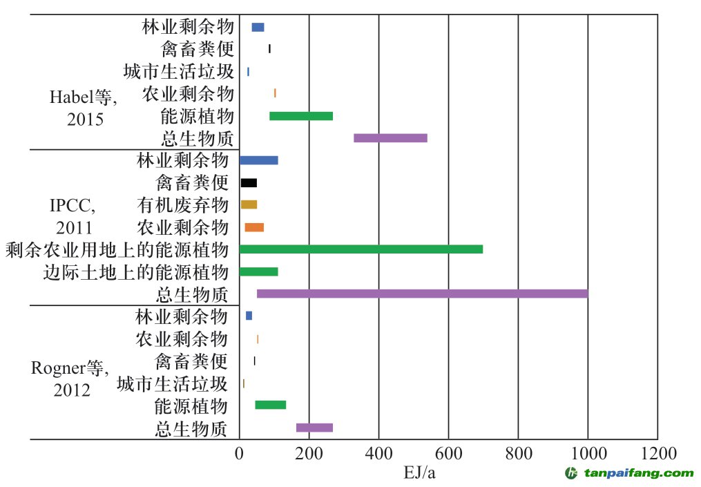 考慮到生物質(zhì)能可利用條件的限制,IPCC于2011年預(yù)計到2050年全球可用于能源化利用的生物質(zhì)潛在推廣利用水平為100~300 EJ/a[5] 。