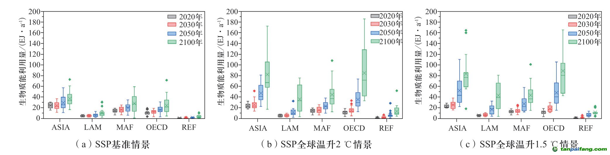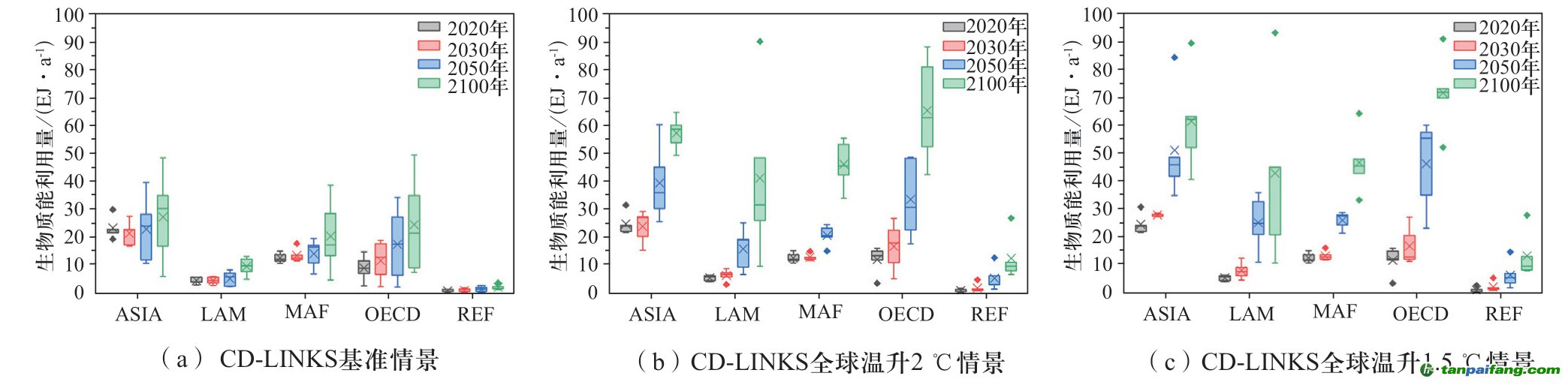 SSP數(shù)據(jù)庫中,全球各區(qū)域的生物質(zhì)能利用量將逐步增加。基準(zhǔn)情景下(見圖4(a)),ASIA、MAF和OECD區(qū)域是發(fā)展較快的地區(qū),從2020年到2100年,這三個區(qū)域的平均生物質(zhì)能利用量分別增加了12.98 EJ/a、13.64 EJ/a和14.06 EJ/a。相對而言,LAM和REF區(qū)域分別增加了5.75 EJ/a和2.58 EJ/a。當(dāng)考慮全球溫升目標(biāo)的影響時,各區(qū)域的生物質(zhì)能利用量相比基準(zhǔn)情景都明顯增加(見圖4(b))。在全球溫升2 ℃情景下,ASIA和OECD區(qū)域的平均生物質(zhì)能利用量在2020年到2100年期間分別增加了58.34 EJ/a和73.47 EJ/a,而LAM、MAF和REF區(qū)域分別增加了30.74 EJ/a、30.27 EJ/a和12.74 EJ/a。而考慮更為嚴格的溫升目標(biāo)時,全球溫升1.5 ℃情景下各區(qū)域的生物質(zhì)能利用量相對于全球溫升2 ℃情景增加的相當(dāng)有限(見圖4(c)),結(jié)合各區(qū)域的生物質(zhì)資源潛力,預(yù)計當(dāng)生物質(zhì)能的利用量達到較高水平時,將更多受制于土地、淡水、糧食安全等上限約束。 本`文@內(nèi)/容/來/自:中-國^碳-排-放^*交*易^網(wǎng)-tan pai fang. com