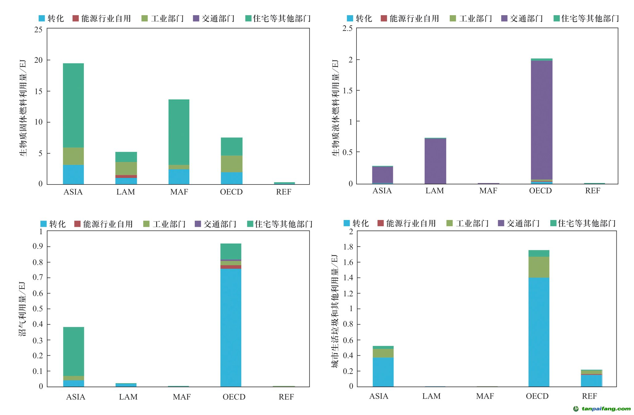注:①基于全球149個國家和地區(qū)的能源數(shù)據(jù)進行核算,由于缺少部分國家的統(tǒng)計數(shù)據(jù),核算的生物質(zhì)能利用總量略低于全球的統(tǒng)計數(shù)據(jù)。②統(tǒng)計的生物質(zhì)液體燃料以t為單位,為方便數(shù)據(jù)之間的對比,按乙醇熱值26.9 MJ/kg進行了換算。 本+文`內(nèi).容.來.自:中`國`碳`排*放*交*易^網(wǎng) t a np ai fan g.com