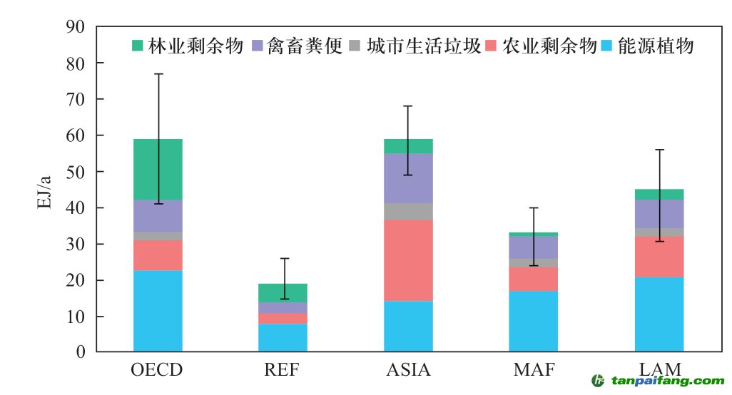 各區(qū)域的生物質(zhì)能潛力也有較大差別。Haberl 等在2010年評估了世界主要區(qū)域的生物質(zhì)能技術(shù)潛力(見圖12),其研究結(jié)果表明2050年OECD區(qū)域的生物質(zhì)資源技術(shù)潛力達到了59 EJ/a,其中林業(yè)剩余物和能源植物占比最大,分別為23 EJ/a和17 EJ/a。ASIA地區(qū)的總生物質(zhì)能技術(shù)潛力為59 EJ/a,其中農(nóng)業(yè)剩余物占比最大,達到23 EJ/a。REF、MAF和LAM區(qū)域的生物質(zhì)能技術(shù)潛力也分別達到19 EJ/a、33 EJ/a和45 EJ/a[20]。各區(qū)域的生物質(zhì)能潛力的不確定范圍也較大,主要以能源植物和林業(yè)剩余物的不確定為主,其中以O(shè)ECD的不確定范圍最大,其生物質(zhì)能技術(shù)潛力為41~77 EJ/a,REF區(qū)域的不確定范圍最小,其生物質(zhì)能技術(shù)潛力為12~23 EJ/a[20]。 內(nèi)/容/來/自:中-國/碳-排*放^交%易#網(wǎng)-tan p a i fang . com