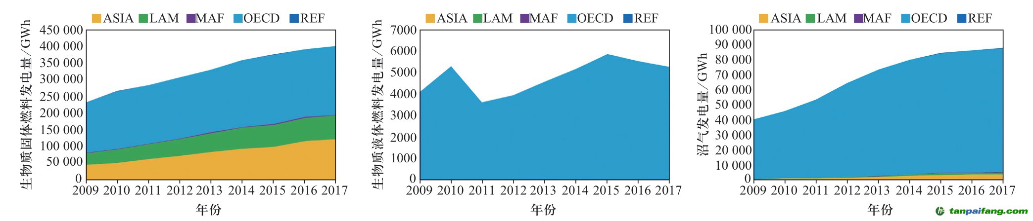 高效的生物質(zhì)能利用方式中,生物質(zhì)發(fā)電是其主要的利用方式之一。根據(jù)2019年IRENA的統(tǒng)計結(jié)果[8],2017年全球生物質(zhì)發(fā)電量達到495 395 GWh,相比于2009年增加了218 335 GWh。OECD區(qū)域是生物質(zhì)發(fā)電量最大的地區(qū),2017年OECD區(qū)域生物質(zhì)發(fā)電量達到291 214 GWh,其中生物質(zhì)固體燃料占70.05%,液體生物質(zhì)燃料占1.80%,沼氣發(fā)電占28.15%。ASIA區(qū)域、LAM區(qū)域和MAF區(qū)域主要是生物質(zhì)固體燃料發(fā)電,2017年ASIA區(qū)域生物質(zhì)發(fā)電達到126 718 GWh,其中生物質(zhì)固體燃料發(fā)電占96.74%,沼氣發(fā)電占3.26%。LAM區(qū)域和MAF區(qū)域2017年生物質(zhì)發(fā)電分別為72 112 GWh和3453 GWh,其中生物質(zhì)固體燃料發(fā)電分別占98.21%和89.34%。REF區(qū)域的生物質(zhì)發(fā)電量最小,2017年生物質(zhì)發(fā)電量為663 GWh,主要是生物質(zhì)固體燃料和沼氣發(fā)電,分別占70.23%和29.77%(見圖2)。 本*文`內(nèi)/容/來/自:中-國-碳^排-放“交|易^網(wǎng)-tan pai fang . c o m