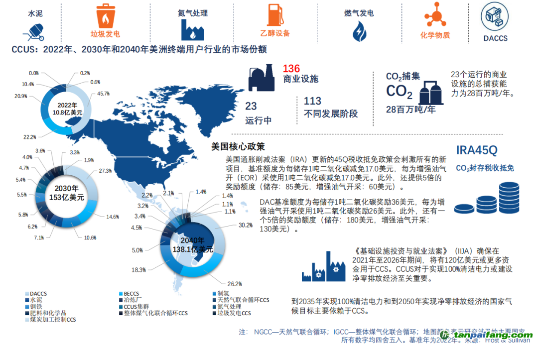 2021年頒布的《通貨膨脹削減法案》,又?jǐn)U大了《45Q法案》的稅收抵免計(jì)劃,進(jìn)一步減少了建造和運(yùn)營(yíng)碳捕捉設(shè)施的成本,拉動(dòng)了ccus的商業(yè)化,截至2022年底,全球運(yùn)營(yíng)項(xiàng)目碳捕集容量的45%來(lái)自美國(guó)。