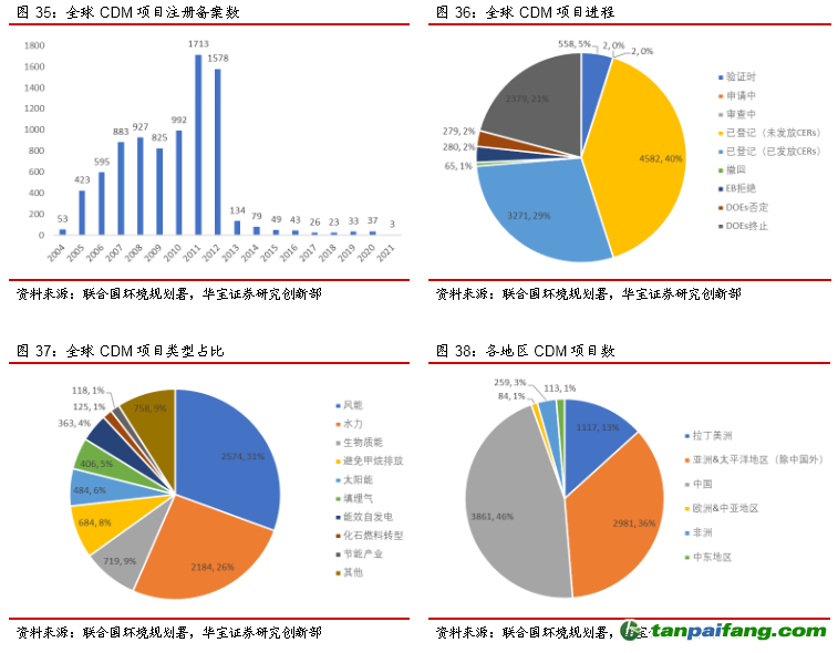 根據(jù)聯(lián)合國環(huán)境規(guī)劃署數(shù)據(jù),截至2021年4月1日,除去撤回項目65個,EB拒絕項目280個,DOEs否定、終止項目分別279、2379個外,全球注冊備案CDM項目數(shù)共計8415個,其中,處于驗證階段項目558個,申請審查中項目4個,已登記未發(fā)放CERs項目4582個,已登記已發(fā)放CERs項目3271個。從注冊時間來看,2004-2012年,全球CDM項目處于高速發(fā)展期,9年注冊備案項目7989個,占比近95%,2013年后,歐盟碳排放交易體系進入第三階段,明確可抵消的CERs需來自最不發(fā)達國家,全球最大碳排放體系對抵消機制的限制使得注冊CDM項目數(shù)急劇減少。