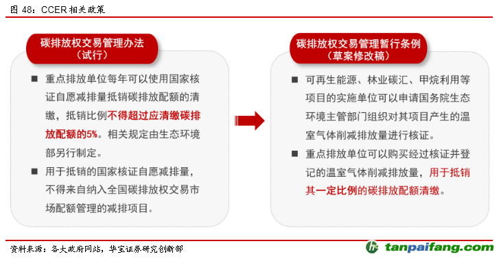 取消了核證減排抵消比例的量化指標(biāo)。2021年3月,生態(tài)環(huán)境部發(fā)布《碳排放權(quán)交易管理暫行條例(草案修改稿)》(征求意見稿)(簡稱“暫行條例”),本次暫行條例明確提出重點(diǎn)排放單位可以購買經(jīng)過核證并登記的溫室氣體削減排放量,用于抵銷其一定比例的碳排放配額清繳。相比而言,2021年1月發(fā)布的《碳排放權(quán)交易管理辦法(試行)》(簡稱“管理辦法”)明確抵消比例為5%。暫行條例沒有明確的量化為增加核證減排量抵消碳排放配額創(chuàng)造了空間,放寬了實(shí)施可再生能源、林業(yè)碳匯、甲烷利用等項(xiàng)目來實(shí)施碳減排。 本文@內(nèi)/容/來/自:中-國-碳^排-放-交易&*網(wǎng)-tan pai fang . com