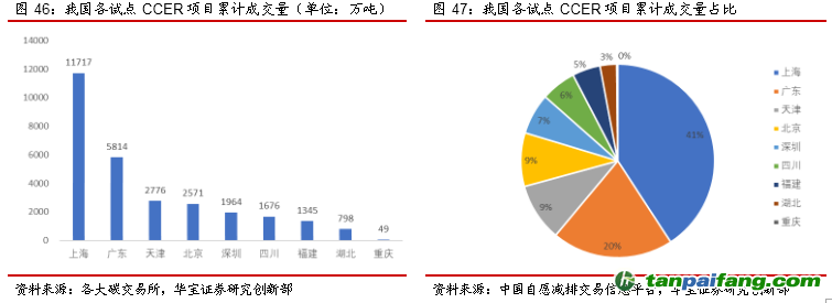 上海、廣東CCER累計(jì)成交量領(lǐng)先,占比超60%。截至2021年4月23日,中國碳市場CCER累計(jì)成交2.87億噸,上海、廣東CCER成交量領(lǐng)先,上海市場累計(jì)成交量1.17億噸,占全國累計(jì)成交量的41%,廣東市場累計(jì)成交量5814萬噸,占比20%左右,北京、天津累計(jì)成交量均在2500萬噸左右,占比分別為9%左右,深圳、四川、附件見累計(jì)成交量位于1300-2000萬噸之間,占比約為5%-7%,湖北、重慶成交量較低,占比不足5%。 內(nèi)/容/來/自:中-國-碳-排-放*交…易-網(wǎng)-tan pai fang . com