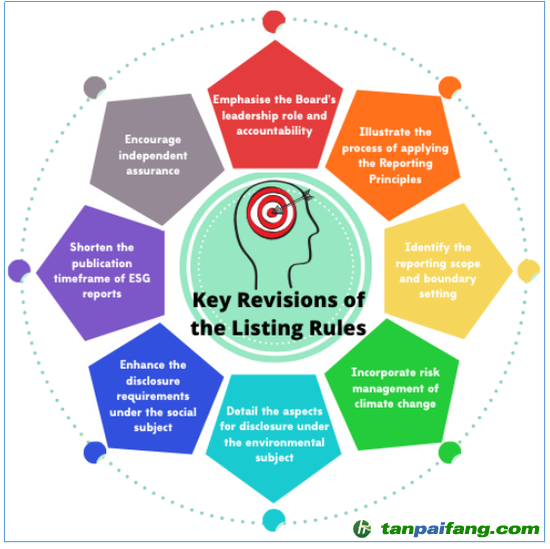 該修訂版的ESG報(bào)告標(biāo)準(zhǔn)將適用于從2020年7月1日之后開(kāi)始的新財(cái)政年度中,所有在港交所上市的發(fā)行人的ESG報(bào)告,其中包括職業(yè)健康與安全披露,董事會(huì)對(duì)ESG披露的監(jiān)督以及縮短ESG報(bào)告發(fā)布的截止日期等。港交所此次修訂ESG報(bào)告標(biāo)準(zhǔn)的重點(diǎn)在于建立公司的ESG報(bào)告框架,要求披露董事會(huì)在參與ESG風(fēng)險(xiǎn)管理中的作用,鼓勵(lì)探索氣候變化與公司可持續(xù)發(fā)展之間的聯(lián)系,以及進(jìn)一步確立發(fā)行人在披露ESG績(jī)效和報(bào)告準(zhǔn)備中關(guān)于重要性原則的應(yīng)用。