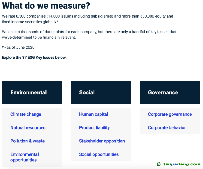 MSCI是國際知名的指數(shù)編制公司,其ESG評級主要通過公開信息抓取8500家上市公司37項ESG關(guān)鍵議題,涉及環(huán)境、社會和治理三大領(lǐng)域,評級結(jié)果已成為全球各大資產(chǎn)管理機(jī)構(gòu)制定投資決策的重要依據(jù)。 本文+內(nèi)-容-來-自;中^國_碳+排.放_交^易=網(wǎng) t a n pa ifa ng .c om