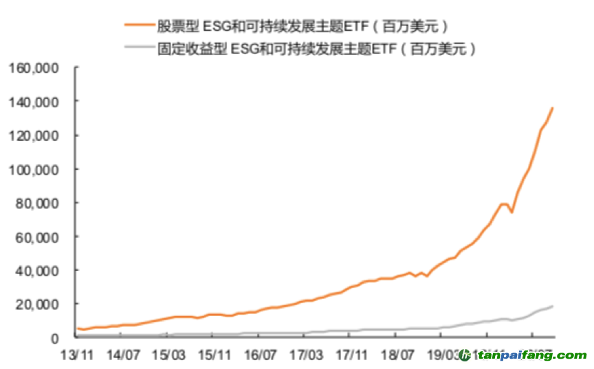根據(jù)平安證券研報,ESG被動投資產(chǎn)品規(guī)模近兩年迎來快速增長。ESG ETF基金自2002年推出首支產(chǎn)品以來,產(chǎn)品規(guī)模穩(wěn)步增長,且近兩年有加快趨勢,截至2020年10月16日,目前股票和固收型ESG主題ETF總規(guī)模已超1500億美元,較2019年底增長85%。2020年,ESG ETF的資金凈流入規(guī)模大幅攀升。今年全球ESG ETF月均凈流入約55億美元,較2019年月均25億美元的凈流入規(guī)模增長近120%。