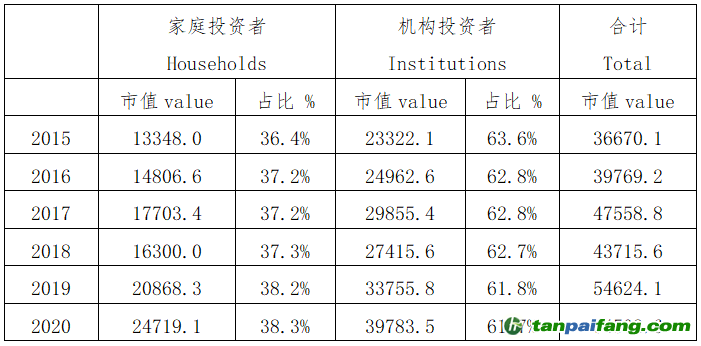 表2 美國家庭投資者或機構(gòu)投資者持有股票市值和占比(10億美元) 本`文@內(nèi)/容/來/自:中-國^碳-排-放^*交*易^網(wǎng)-tan pai fang. com