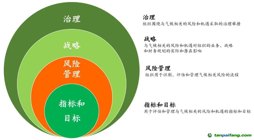 4. TCFD四要素氣候信息披露框架。2017年,TCFD發(fā)布了備受關(guān)注的《工作小組關(guān)于氣候相關(guān)財(cái)務(wù)信息披露的建議書》,提出了由治理、戰(zhàn)略、風(fēng)險(xiǎn)管理、指標(biāo)和目標(biāo)等四大核心要素組成的氣候信息披露框架,如圖6所示。 本*文@內(nèi)-容-來-自;中_國_碳^排-放*交-易^網(wǎng) t an pa i fa ng . c om