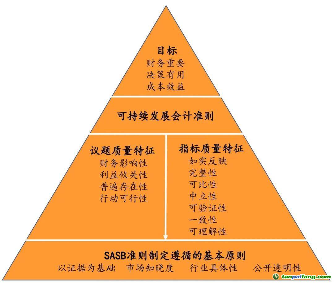 與其他ESG報(bào)告框架相比,SASB發(fā)布的可持續(xù)發(fā)展會(huì)計(jì)準(zhǔn)則(SAS)具有三個(gè)顯著特點(diǎn):一是在2017年頒布了可持續(xù)發(fā)展報(bào)告概念框架(如圖4所示),用于指導(dǎo)SAS的制定;二是正視行業(yè)差異,其所制定的77個(gè)準(zhǔn)則對應(yīng)77個(gè)不同行業(yè),更具針對性和適用性;三是每個(gè)準(zhǔn)則均設(shè)定會(huì)計(jì)指標(biāo)和定性指標(biāo),更具可操作性和可驗(yàn)證性。 本+文+內(nèi).容.來.自:中`國`碳`排*放*交*易^網(wǎng) t a np ai fan g.com