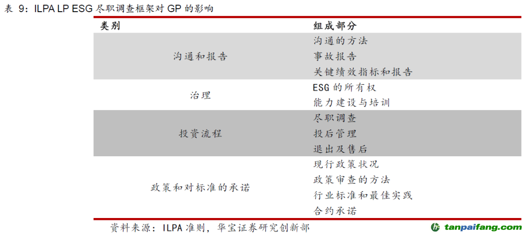 在ILPA最新的3.0準則中,協(xié)會為各大LP建立ESG評估工具提供指導,該指導旨在幫助LP評估自身選擇GP的ESG盡職調查工作的情況,為后續(xù)與GP溝通提供支撐,并且可以清晰了解GP的ESG整合情況;同時方便LP了解同行選擇的GP對于ESG的整合情況。 本@文$內.容.來.自:中`國`碳`排*放^交*易^網 t a np ai fan g.c om