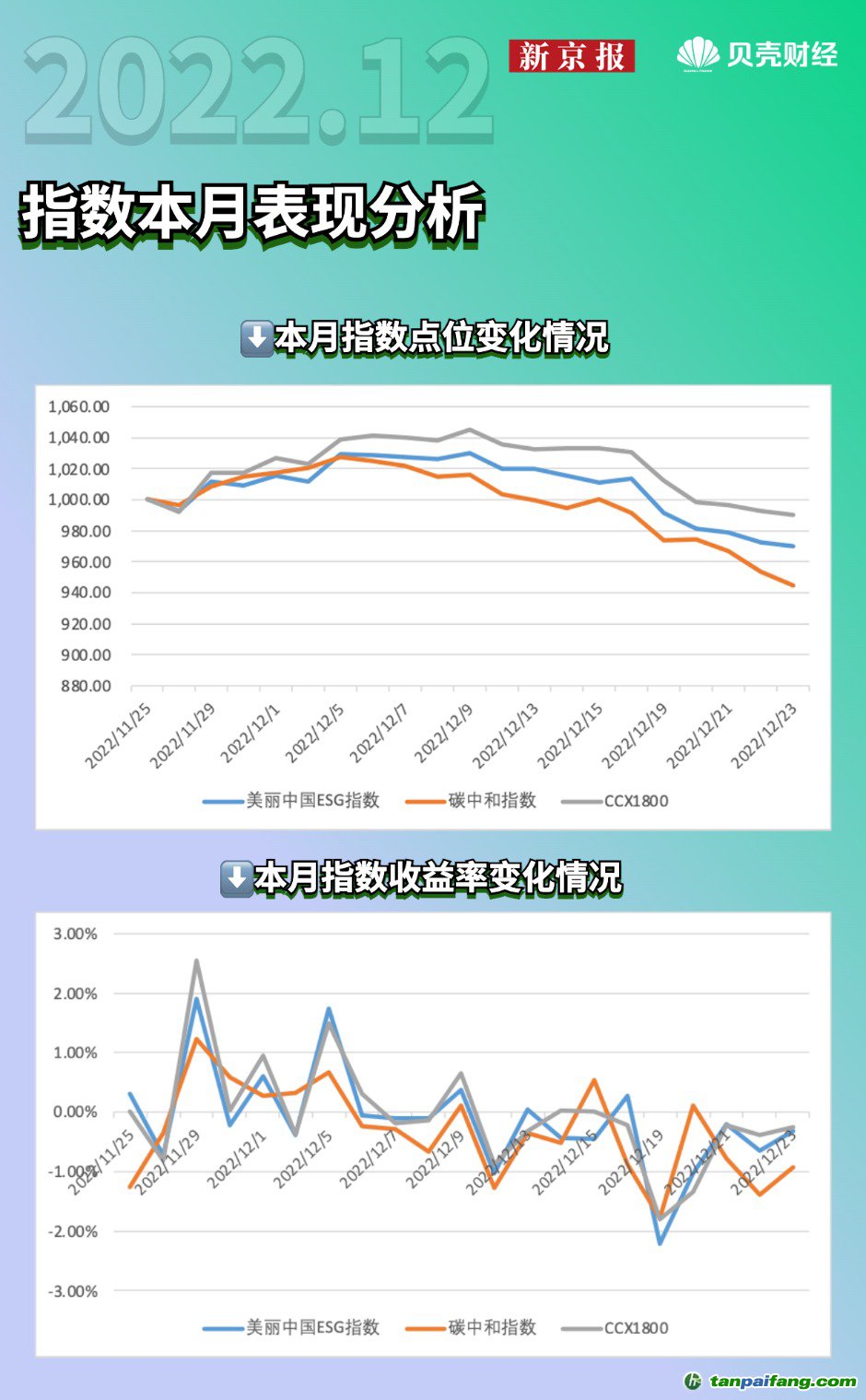 中誠信指數(shù)選取在2022年11月26日-2022年12月25日的數(shù)據(jù),觀察貝殼財經(jīng)中誠信美麗中國ESG指數(shù)與碳中和指數(shù)的表現(xiàn)。 本+文`內(nèi)/容/來/自:中-國-碳-排-放-網(wǎng)-tan pai fang . com
