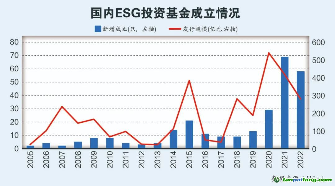 近年來ESG投資浪潮席卷全球,投資金額占全球資產(chǎn)管理規(guī)模的三分之一左右。國(guó)內(nèi)隨著雙碳目標(biāo)的推進(jìn)和實(shí)施,2021年以來ESG投資發(fā)展駛?cè)肟燔嚨?。證券時(shí)報(bào)·中國(guó)資本市場(chǎng)研究院統(tǒng)計(jì),截至2022年末,境內(nèi)成立的ESG投資基金合計(jì)273只(不同份額未合并),累計(jì)發(fā)行規(guī)模超3150億元;其中2021年新成立69只,接近過去5年的總和,成立數(shù)量創(chuàng)歷史之最。