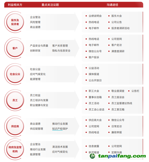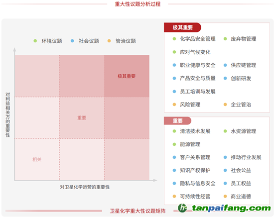 此外,公司首次繪制“重大性議題矩陣”,清晰地展示了21個(gè)議題的重要性級(jí)別,包含應(yīng)對(duì)氣候變化、員工培訓(xùn)與發(fā)展、創(chuàng)新發(fā)展等10個(gè)極其重要議題,能源管理、員工權(quán)益等11個(gè)重要議題。 本`文-內(nèi).容.來.自:中`國(guó)^碳`排*放*交^易^網(wǎng) ta np ai fan g.com