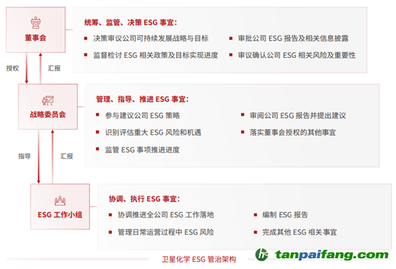 為系統(tǒng)性推進(jìn)衛(wèi)星化學(xué)董事會(huì)對(duì)公司可持續(xù)發(fā)展的統(tǒng)籌監(jiān)管,提升公司全員自上而下對(duì)ESG事宜的了解和重視程度,衛(wèi)星化學(xué)搭建了由董事會(huì)、戰(zhàn)略委員會(huì)、ESG工作小組構(gòu)成的ESG管治架構(gòu)。ESG工作小組管理日常運(yùn)營(yíng)過程中ESG風(fēng)險(xiǎn),戰(zhàn)略委員會(huì)識(shí)別評(píng)估重大ESG風(fēng)險(xiǎn)和機(jī)遇,董事會(huì)審議確認(rèn)ESG相關(guān)風(fēng)險(xiǎn)及重要性。 本`文@內(nèi)-容-來-自;中_國(guó)_碳排0放_(tái)交-易=網(wǎng) t an pa ifa ng . c om