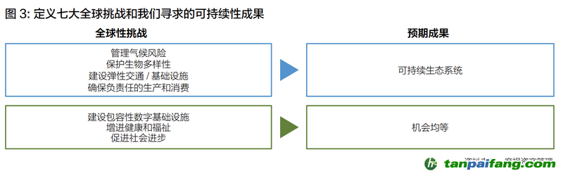 通過將支持平等機會和可持續(xù)生態(tài)系統(tǒng)的全球經(jīng)濟目標與我們深入的行業(yè)分析所獲得的見解相結合, 我們的 SIE 框架確定了實現(xiàn)可持續(xù)性成果最關鍵的七大環(huán)境和社會挑戰(zhàn),即保護生物多樣性、管理氣候風險、建設彈性交通/ 基礎設施、確保負責任的生產(chǎn)和消費、建設包容性數(shù)字基礎設施、增進健康和福祉、促進社會進步 ( 見下圖 )。 本文@內/容/來/自:中-國-碳^排-放-交易&*網(wǎng)-tan pai fang . com
