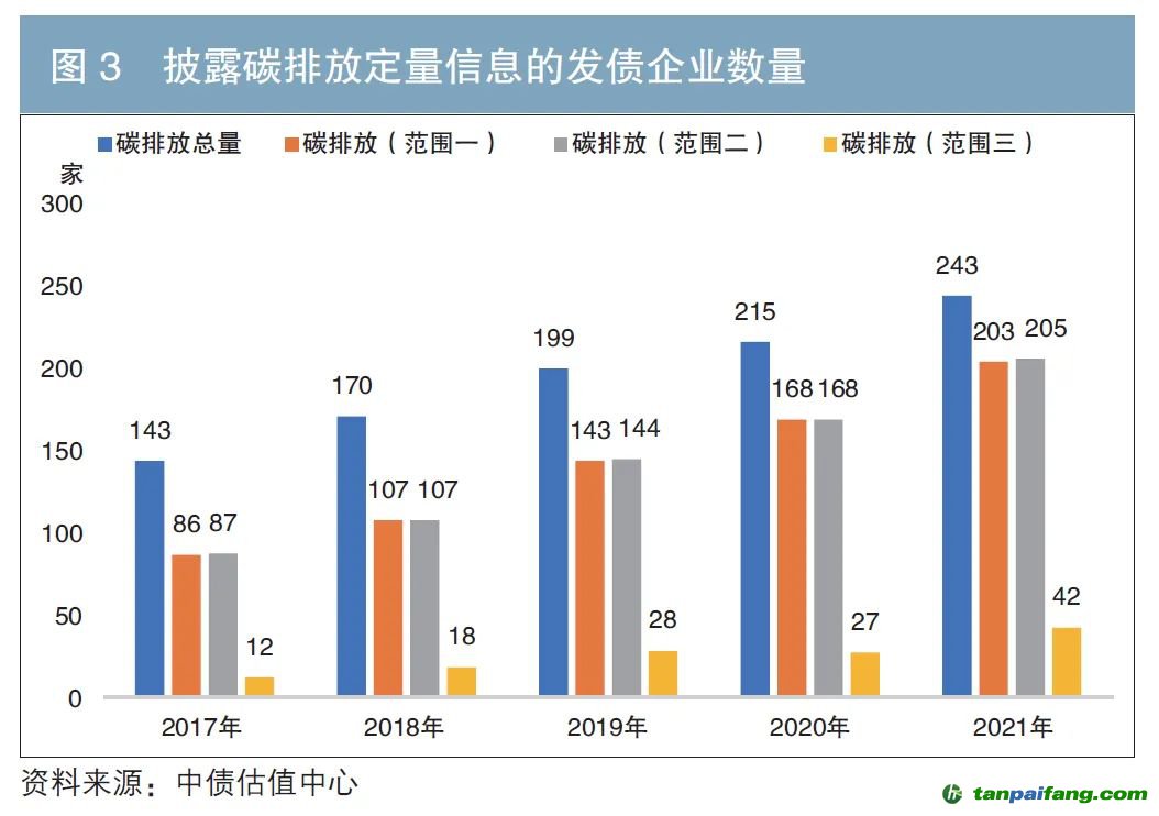 相較定性信息,雖然披露碳排放總量、碳減排總量等定量信息的企業(yè)數(shù)量也呈現(xiàn)增長(zhǎng)趨勢(shì),但2021年僅有9.96%的上市公司和6.84%的發(fā)債企業(yè)進(jìn)行了相關(guān)披露。如圖2、圖3所示,碳排放總量指標(biāo)的披露情況相對(duì)較好,2021年有369家上市公司(約占7%)和243家發(fā)債企業(yè)(約占6%)披露了碳排放總量。從細(xì)分范圍來(lái)看,約5%的上市公司和發(fā)債企業(yè)披露了碳排放范圍一(由企業(yè)直接控制或擁有的排放源所產(chǎn)生的排放)和范圍二(企業(yè)自用的外購(gòu)電力、蒸汽、供暖和供冷等產(chǎn)生的間接排放)的信息,僅有1%左右的上市公司和發(fā)債企業(yè)披露了范圍三(企業(yè)除范圍二之外的所有間接排放,包括價(jià)值鏈上游和下游的排放)的信息。 內(nèi)/容/來(lái)/自:中-國(guó)-碳-排-放*交…易-網(wǎng)-tan pai fang . com