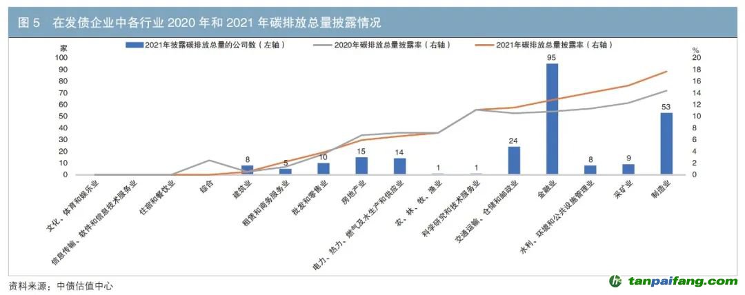 具體來(lái)看,在上市公司中,2021年金融業(yè)上市公司對(duì)碳排放總量的披露率達(dá)到46%,較2020年增長(zhǎng)8個(gè)百分點(diǎn)(見圖4)。電力、熱力、燃?xì)饧八a(chǎn)和供應(yīng)業(yè),采礦業(yè),交通運(yùn)輸、倉(cāng)儲(chǔ)和郵政業(yè)的企業(yè)披露率超過(guò)10%。在發(fā)債企業(yè)中,2021年披露率超過(guò)10%的行業(yè)包括制造業(yè),采礦業(yè),水利、環(huán)境和公共設(shè)施管理業(yè),金融業(yè),交通運(yùn)輸、倉(cāng)儲(chǔ)和郵政業(yè),這些行業(yè)的披露率較2020年提升了2個(gè)百分點(diǎn)左右(見圖5)。 本+文`內(nèi).容.來(lái).自:中`國(guó)`碳`排*放*交*易^網(wǎng) t a np ai fan g.com