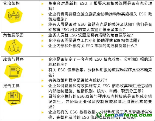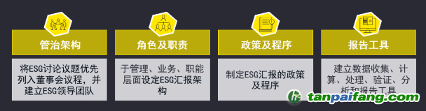 面對上述管理ESG信息的痛點(diǎn),上市公司可考慮從管治架構(gòu)、角色及職責(zé)、政策與程序及報(bào)告工具四個(gè)角度提升ESG信息的質(zhì)量,以更有效率地向利益相關(guān)者傳達(dá)公司的可持續(xù)發(fā)展進(jìn)程: