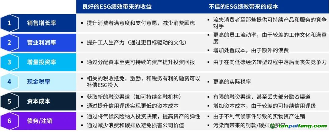 有些企業(yè)和投資人錯(cuò)誤地認(rèn)為ESG表現(xiàn)的提升很難量化為實(shí)際的財(cái)務(wù)表現(xiàn),事實(shí)上ESG表現(xiàn)的改善,并非僅僅是沒有經(jīng)濟(jì)價(jià)值的公益行為,它與公司的可持續(xù)經(jīng)營能力息息相關(guān),同時(shí),也常常可以轉(zhuǎn)換成經(jīng)營能力和財(cái)務(wù)指標(biāo)的量化提升。畢馬威的全球研究總結(jié),ESG的良好績效將在以下6大板塊為企業(yè)也創(chuàng)造正面價(jià)值: