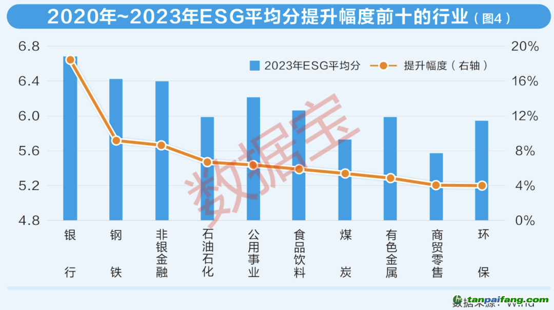 從行業(yè)ESG表現(xiàn)來看,在樣本量大于30家公司的行業(yè)中,銀行、鋼鐵、非銀金融行業(yè)2023年Wind ESG平均分分別為6.68分、6.42分和6.4分,分別較2020年底提升18.5%、9.2%和8.6%,平均分和提升幅度均位列前三;社會(huì)服務(wù)、通信行業(yè)ESG表現(xiàn)相對(duì)較差,2023年Wind ESG平均分較2020年下降7.1%、3.9%(圖4)。 禸嫆@唻洎:狆國(guó)湠棑倣茭昜蛧 τāńpāīfāńɡ.cōm