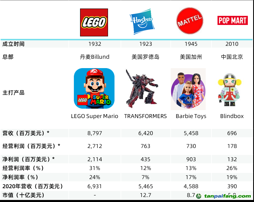 以下是全球主流玩具公司的市值情況,因為樂高是非上市公司,所以沒有市值,但是通過以下數(shù)據(jù)仍然可以了解樂高競爭對手和玩具行業(yè)的整體情況。