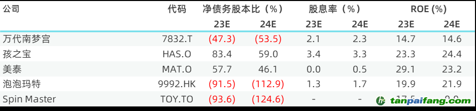 我們選擇美國上市公司孩之寶和美泰,和一年半之前剛剛上市的中國玩具公司泡泡瑪特作為對比。此外,我們還參考了來自日本的南夢宮和加拿大的Spin Master。