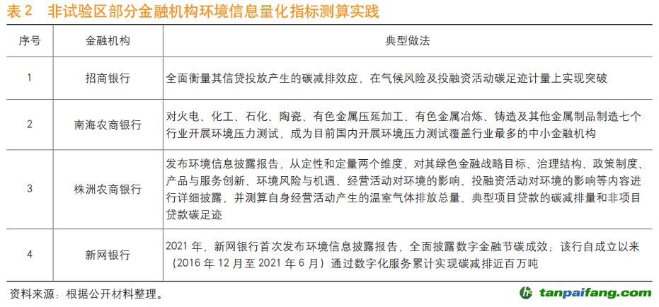 二是指導(dǎo)綠色金融改革創(chuàng)新試驗(yàn)區(qū)(以下簡(jiǎn)稱“試驗(yàn)區(qū)”)金融機(jī)構(gòu)率先開展環(huán)境信息披露。2021年,人民銀行編制下發(fā)《推動(dòng)綠色金融改革創(chuàng)新試驗(yàn)區(qū)金融機(jī)構(gòu)環(huán)境信息披露工作方案》,各試驗(yàn)區(qū)人民銀行分支機(jī)構(gòu)、其他監(jiān)管機(jī)構(gòu)、相關(guān)金融機(jī)構(gòu)代表,以及業(yè)界專家組成環(huán)境信息披露工作小組,組織開展綠色金融專業(yè)人才培訓(xùn),強(qiáng)化金融機(jī)構(gòu)能力建設(shè)。截至2021年6月末,各試驗(yàn)區(qū)共有200多家金融機(jī)構(gòu)完成環(huán)境信息披露報(bào)告試編制。這些機(jī)構(gòu)既包括地方法人金融機(jī)構(gòu),也包括全國性商業(yè)銀行的分支機(jī)構(gòu);既包括銀行業(yè)機(jī)構(gòu),也包括保險(xiǎn)公司、證券公司、財(cái)務(wù)公司、信托公司等非銀行業(yè)機(jī)構(gòu)。部分法人金融機(jī)構(gòu)還結(jié)合經(jīng)營發(fā)展戰(zhàn)略需要,積極探索環(huán)境信息量化指標(biāo)測(cè)算(見表1)。 本`文@內(nèi)-容-來-自;中^國_碳0排0放^交-易=網(wǎng) ta n pa i fa ng . co m