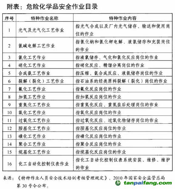 (四)化工企業(yè)從事光氣及光氣化工藝作業(yè)等16種危險化學(xué)品安全作業(yè)(見附表)的特種作業(yè)人員需經(jīng)執(zhí)業(yè)能力培訓(xùn)考核,取得特種作業(yè)操作證后,方可持證上崗。特種作業(yè)人員必須具備高中以上學(xué)歷。從事特種設(shè)備作業(yè)的人員,必須取得相應(yīng)特種設(shè)備作業(yè)人員資格,方可上崗作業(yè)。