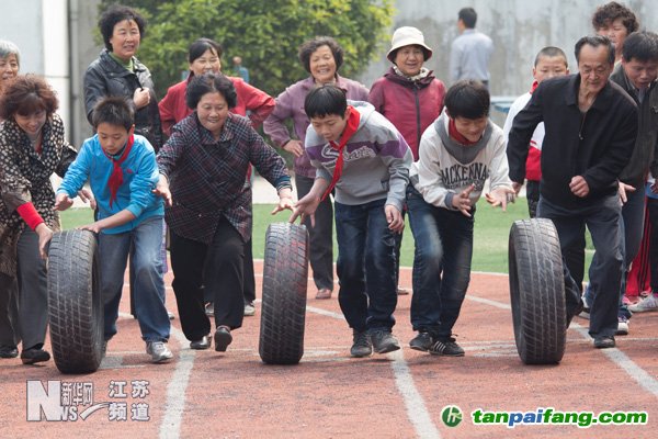 老少選手在“滾輪胎”項(xiàng)目中角逐