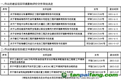 根據(jù)建設(shè)項(xiàng)目環(huán)境影響評(píng)價(jià)審批程序和建設(shè)項(xiàng)目竣工環(huán)境保護(hù)驗(yàn)收管理的有關(guān)規(guī)定,經(jīng)審查,2015年6月1日~2015年6月15日我部對(duì)7個(gè)建設(shè)項(xiàng)目環(huán)境影響評(píng)價(jià)文件和3個(gè)建設(shè)項(xiàng)目竣工環(huán)境保護(hù)驗(yàn)收申請(qǐng)作出審批決定?,F(xiàn)將作出的審批決定予以公告,公告期為2015年6月16日~2015年6月22日(7日)。 禸嫆@唻洎:狆國(guó)湠棑倣茭昜蛧 τāńpāīfāńɡ.cōm