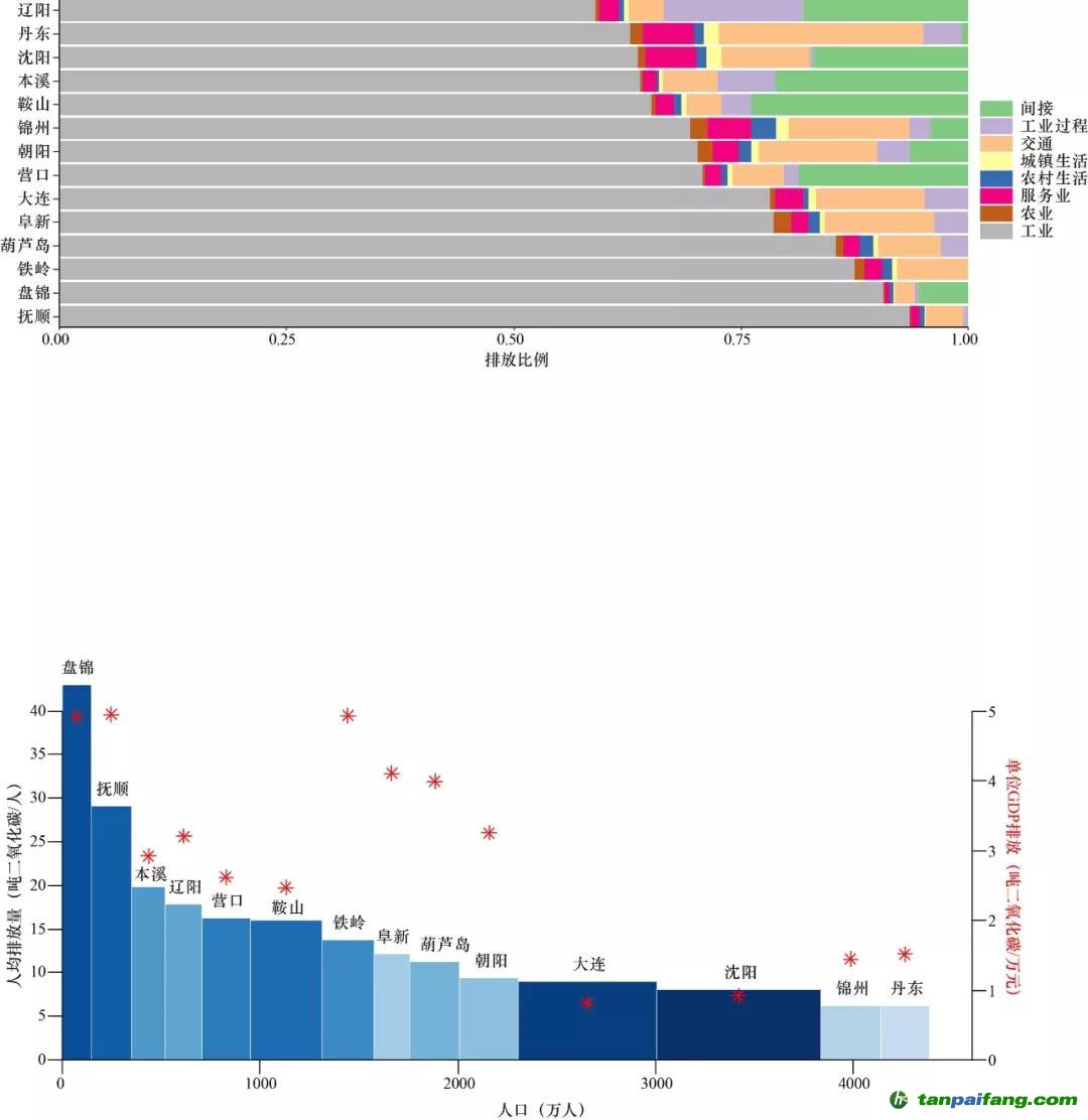 注:上圖是排放結(jié)構(gòu),下圖是城市人均排放和單位GDP排放柱形圖。下圖中:柱形高度(左Y軸)代表人均二氧化