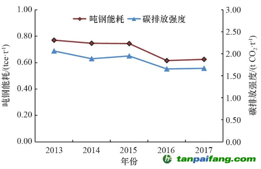 碳排放強度和噸鋼能耗變化趨勢基本一致,隨著年份的增加呈下降趨勢。且2013—2017年碳排放強度減小速度大于噸鋼能耗減小速度。 本*文@內(nèi)-容-來-自;中_國_碳^排-放*交-易^網(wǎng) t an pa i fa ng . c om