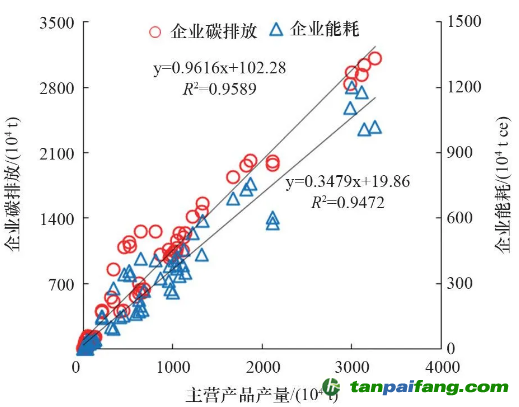圖3 CO2排放和能耗與主營產(chǎn)品產(chǎn)量的關(guān)系 禸嫆@唻洎:狆國湠棑倣茭昜蛧 τāńpāīfāńɡ.cōm