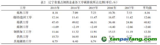 但隨著年份的變化,遼寧省鋼鐵企業(yè)不同工序的碳排放量所發(fā)揮的作用有所改變。2013年煉鐵工序碳排放量最多,其次為供熱工序;2017年則轉(zhuǎn)變?yōu)槠渌o助工序碳排放量最多,其次為煉鐵工序。(表2) 本`文@內(nèi)/容/來/自:中-國^碳-排-放^*交*易^網(wǎng)-tan pai fang. com