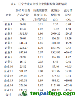 基于遼寧省主營產(chǎn)品產(chǎn)量和歷史排放強度可知,遼寧省鋼鐵行業(yè)納管的15家企業(yè)配額總量為10700.51萬 tCO2。 本`文@內(nèi)-容-來-自;中^國_碳0排0放^交-易=網(wǎng) ta n pa i fa ng . co m