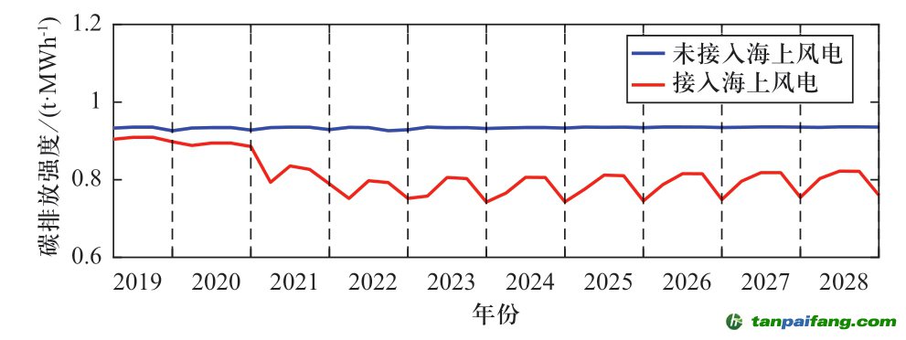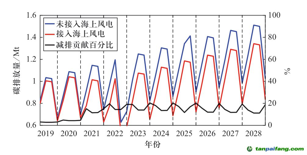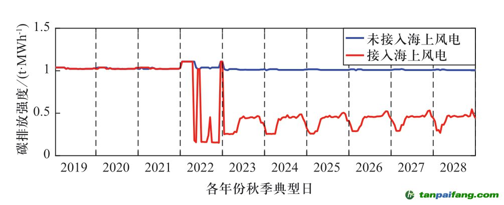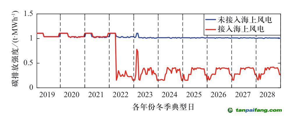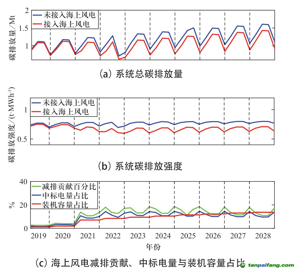 2)未接入海上風(fēng)電時(shí),廣東省系統(tǒng)碳排放強(qiáng)度約0.7~0.8 t/MWh,接入海上風(fēng)電后,系統(tǒng)碳排放強(qiáng)度降低至0.6~0.75 t/MWh。 內(nèi)/容/來(lái)/自:中-國(guó)-碳-排-放*交…易-網(wǎng)-tan pai fang . com