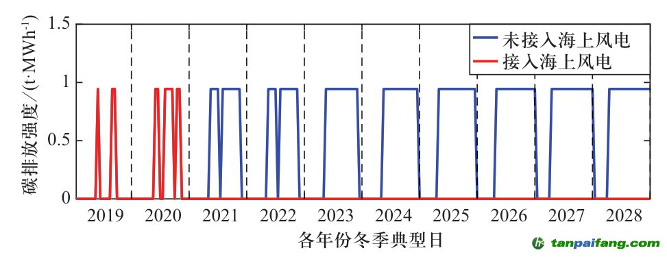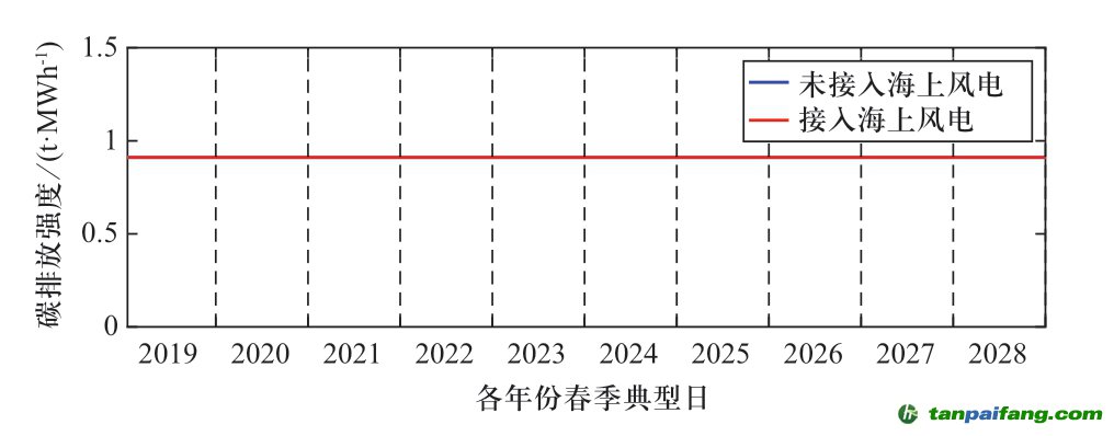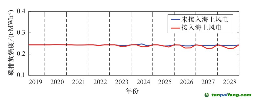在有海上風(fēng)電情況下,A類機(jī)組總碳排放量和系統(tǒng)碳排放強(qiáng)度均基本不變。圖3表示2019—2028年A類機(jī)組系統(tǒng)碳排放強(qiáng)度,一小格表示一年春夏秋冬四季。 禸嫆@唻洎:狆國(guó)湠棑倣茭昜蛧 τāńpāīfāńɡ.cōm