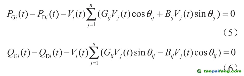 式中:PDi(t)和QDi(t)分別為節(jié)點(diǎn)i在時(shí)間t的有功負(fù)荷和無(wú)功負(fù)荷;Gij、Bij、θij分別為節(jié)點(diǎn)i和節(jié)點(diǎn)j間的電導(dǎo)、電納、相位角;Vi(t)和Vj(t)分別為節(jié)點(diǎn)i和節(jié)點(diǎn) j在時(shí)間t的電壓。 禸嫆@唻洎:狆國(guó)湠棑倣茭昜蛧 τāńpāīfāńɡ.cōm